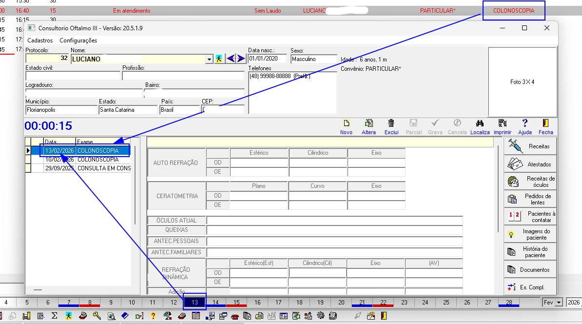Criada funcionalidade que permite registrar, no atendimento do consultório Oftalmo III, o nome do exame vinculado à história clínica do paciente.