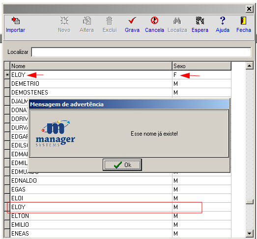 Caso o nome já exista, não será possível inseri-lo novamente, mesmo que associado a um sexo diferente.