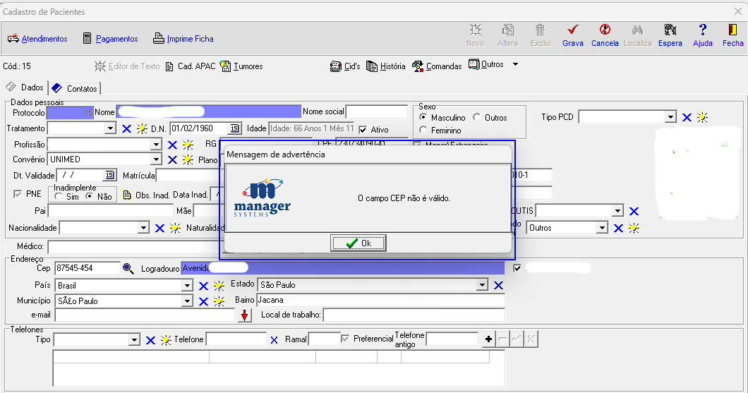 Criada funcionalidade para validação do CEP do paciente, tanto no atendimento quanto no cadastro, utilizando integração com o OpenCEP.