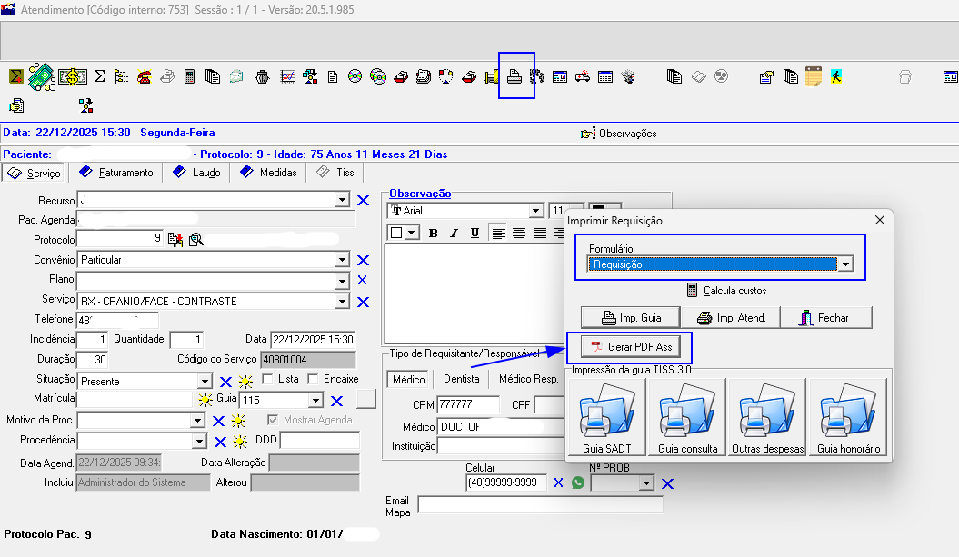 Disponibilizado um novo botão “Gerar PDF ASS”, que permite gerar a requisição em formato PDF e enviá-la automaticamente para o banco de assinaturas. Dessa forma, o documento pode ser assinado diretamente pelo paciente no tablet.