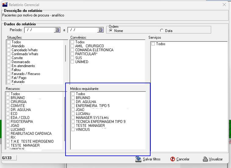 Foi criada uma nova funcionalidade no Relatório G133 que permite filtrar por médico requisitante.