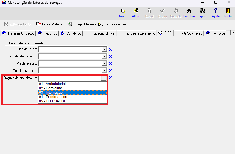 Criado funcionalidade para poder definir na Aba TISS do atendimento o campo Regime de Atendimento. O cadastro fica disponível em Dados Administrativos > Tabela de Serviços > Aba TISS.