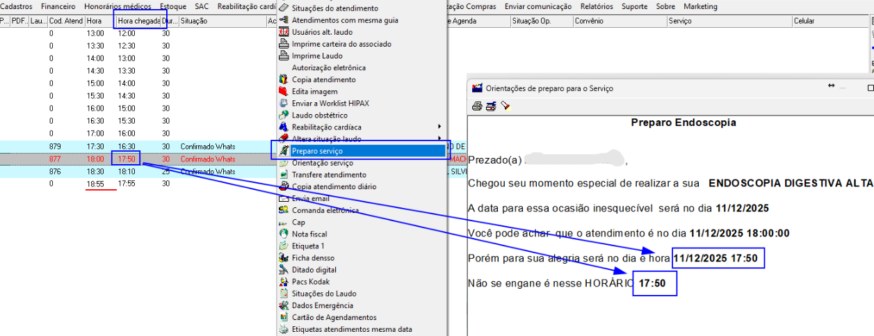 Ao registrar o horário de chegada no sistema, essa informação será automaticamente exibida nas orientações de preparo do serviço.