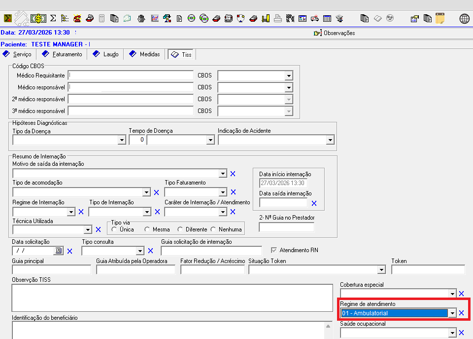 Criada funcionalidade que preenche automaticamente o Regime de Atendimento na aba TISS, conforme a configuração definida no serviço do convênio.