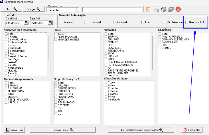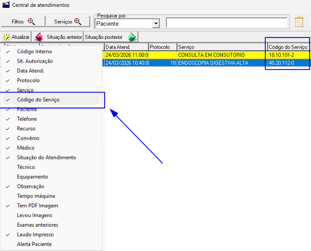Foi incluída na Central de Atendimentos a coluna “Código do Serviço” e a opção de filtro pela situação de autorização “Por Nenhuma Ação”.