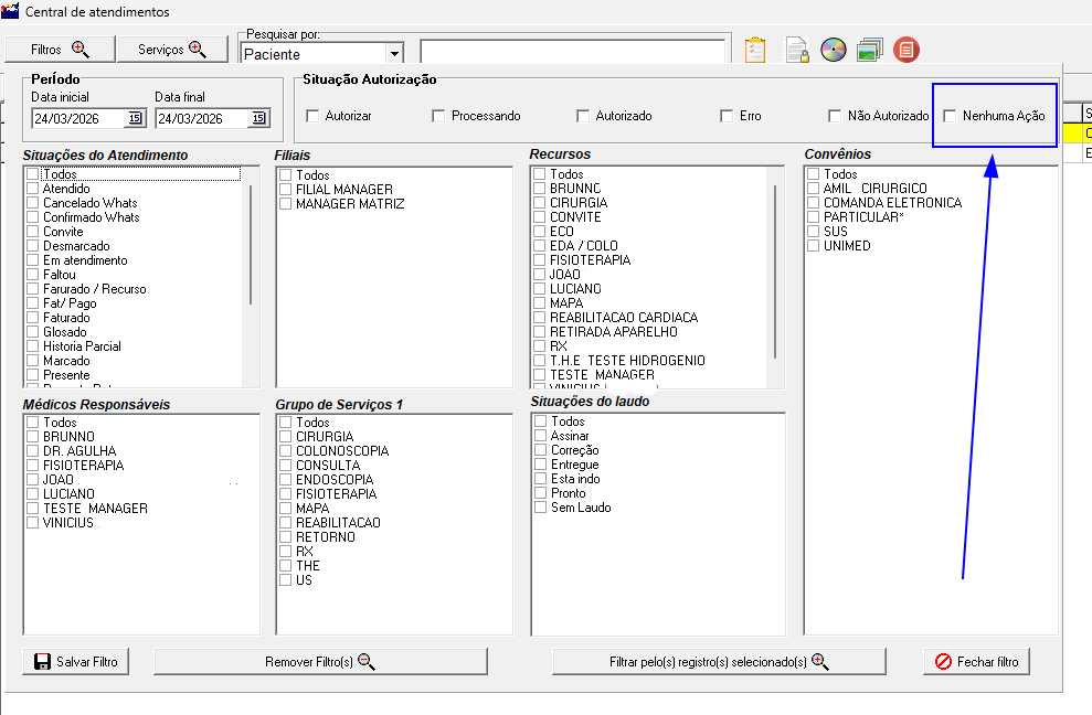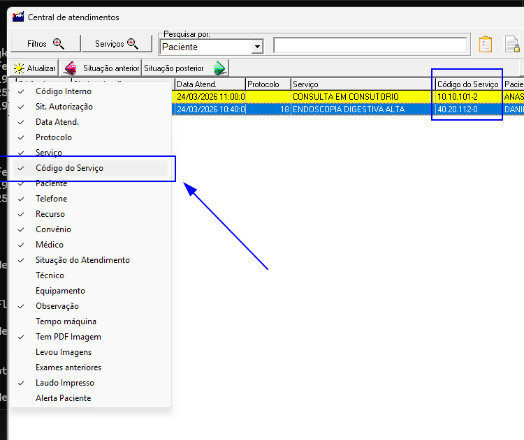 Foi incluída na Central de Atendimentos a coluna “Código do Serviço” e a opção de filtro pela situação de autorização “Por Nenhuma Ação”.