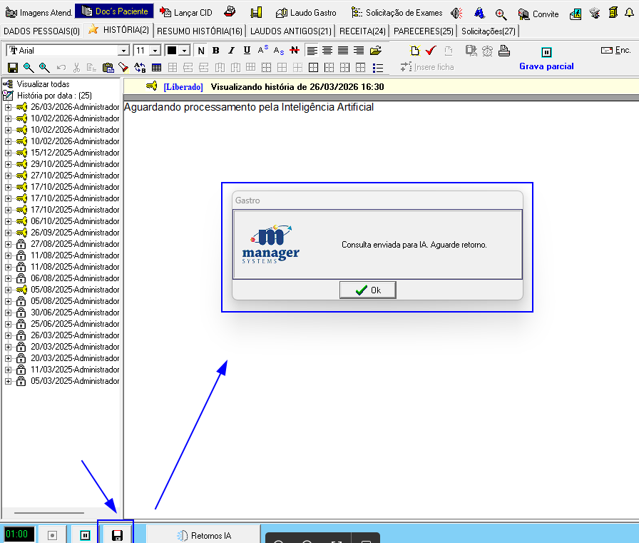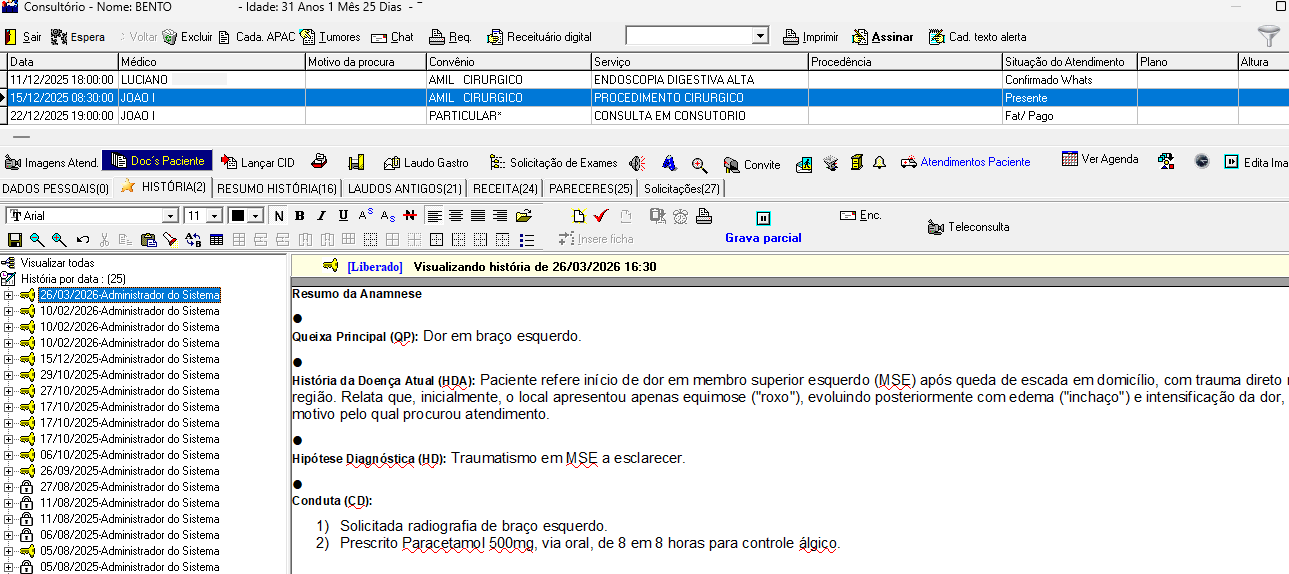 Quando a transcrição for finalizada, na tela do Sisclínica, irá aparecer o texto com o resumo do áudio que foi transcrito pela IA com o registro. Ela estará como história parcial, desta forma, o médico pode editar algo que deseje no retorno da IA.