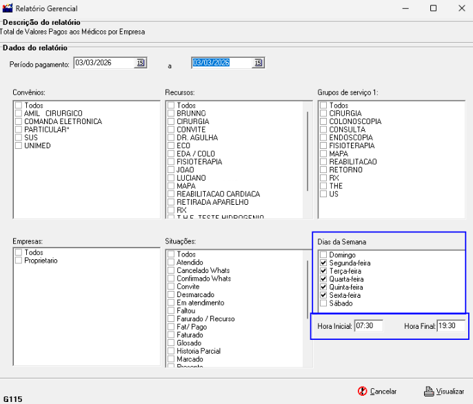Criados novos filtros no relatório G115B, os quais são configuráveis, permitindo a seleção por dia da semana e faixa de horário.
