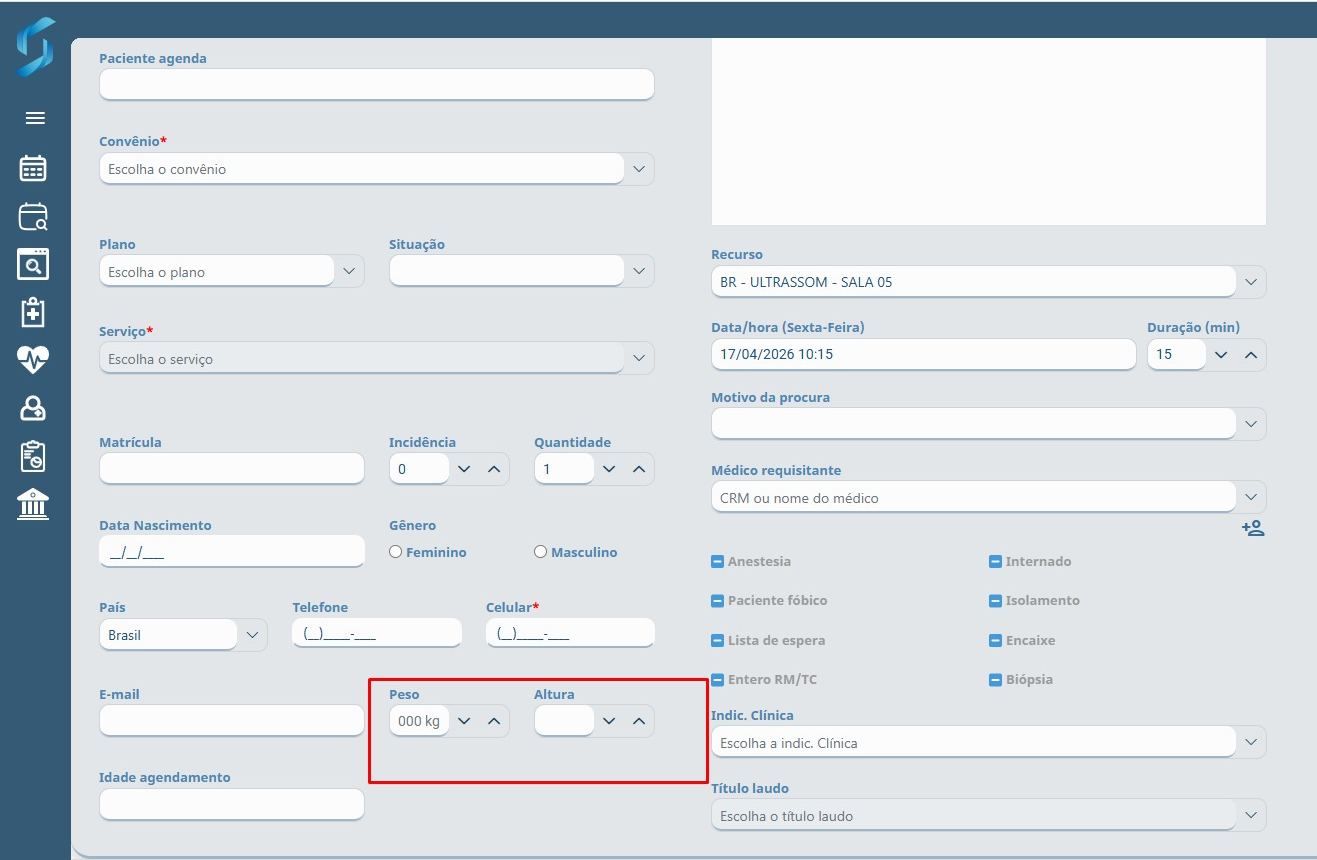 O preenchimento de peso e altura no cadastro do paciente passou a ser obrigatório, entretanto, esta regra será válida somente quando o peso mínimo e máximo estiverem preenchidos no cadastro do aparelho. Isto também leva em consideração para a altura. Desta forma, caso não preenchido estes respectivos campos no atendimento, uma mensagem de atenção será exibida.